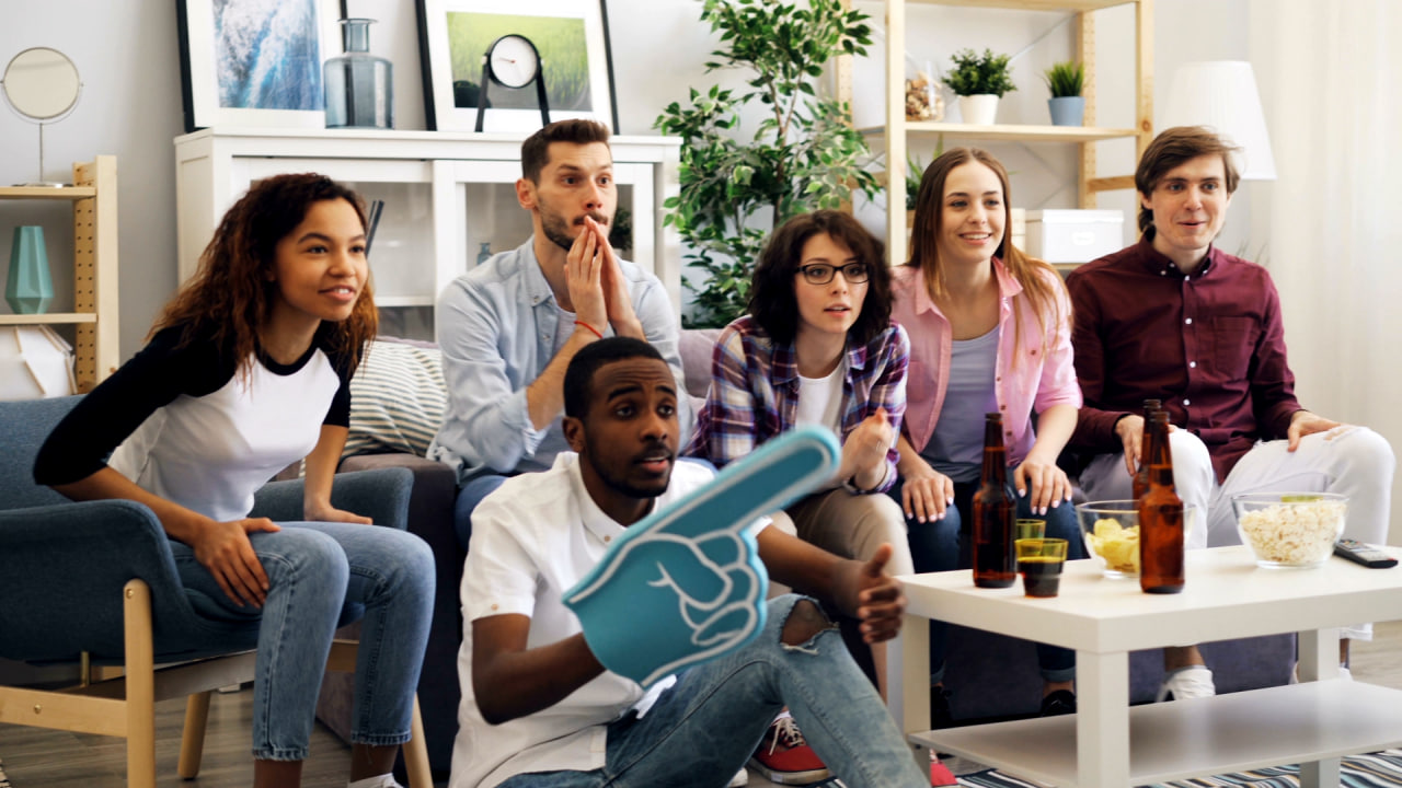 فوتیج جوانان خوشحال از تماشای بازیهای ورزشی در تلویزیون خانه لذت میبرند